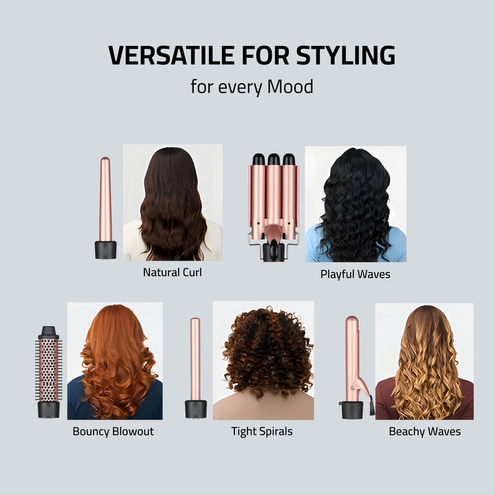 5 Interchangeable Curling Barrels: From tight curls to soft waves